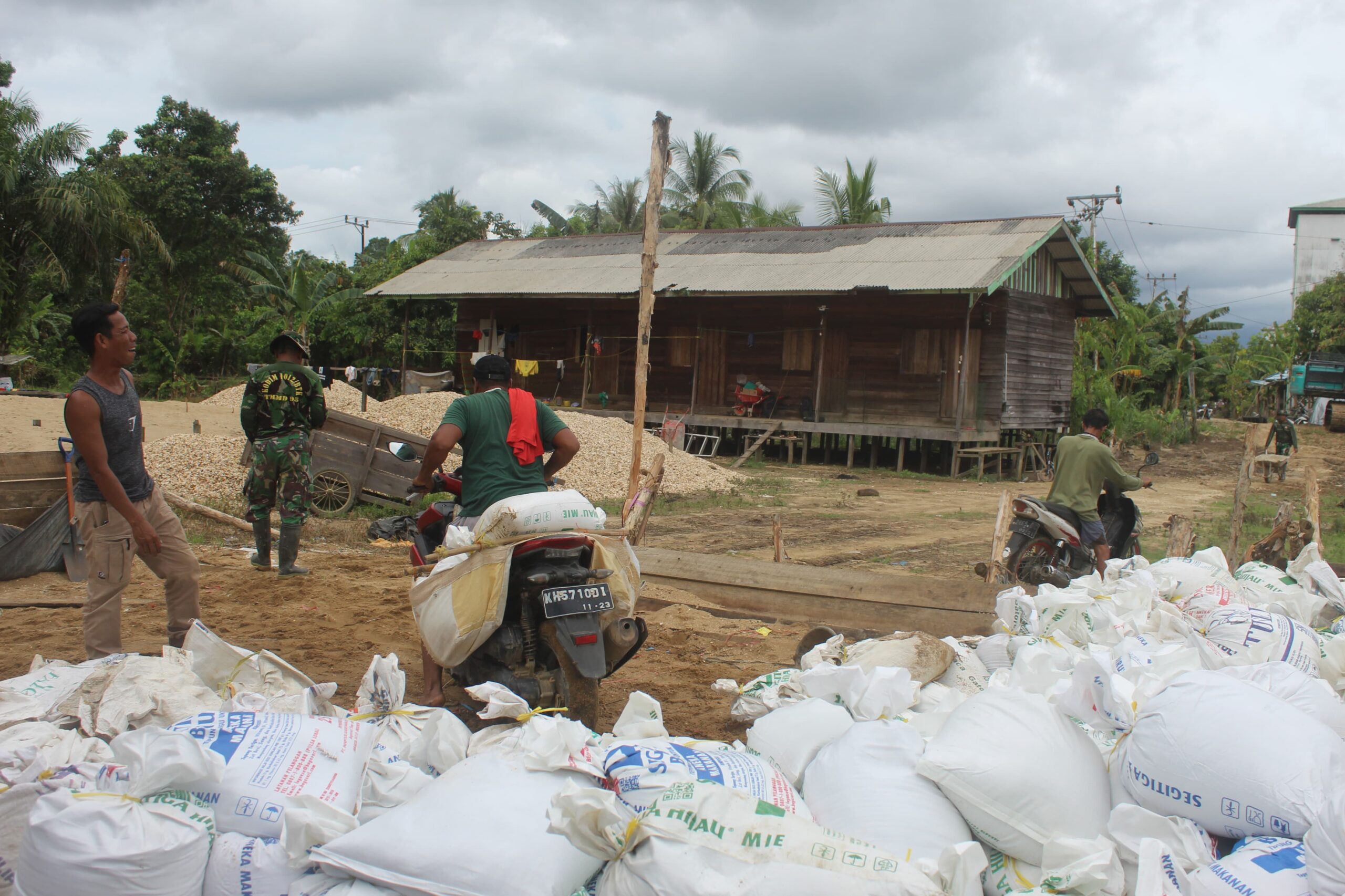 Dengan kondisi jalan sempit dan licin, Satgas TMMD memanfaatkan sepeda motor sebagai alat transportasi utama untuk mengangkut material sirtu (pasir dan batu). Material diangkut dari titik bongkar menuju lokasi pengecoran jalan dengan cara diikat di bagian belakang motor menggunakan karung dan tali.